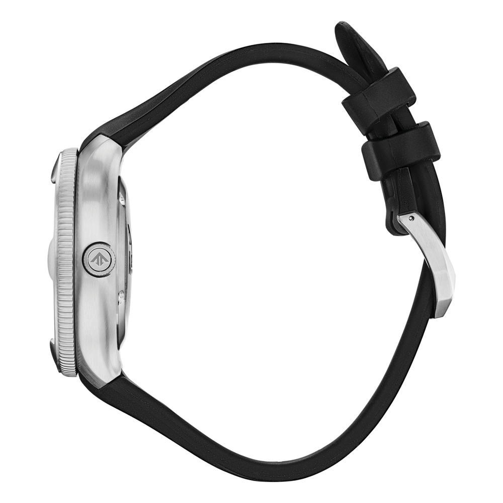 Command the sea in style with the new Promaster Marine. This iconic Citizen men’s dive watch is the latest addition to the Promaster Marine collection with a strikingly original design inspired by the majestic Orca whale. The sporty and functional dive watch features a silver-tone stainless steel case accented by a black three-hand dial and date with elliptical white hour indices and bezel indentations that evoke the shapes and color scheme of the orca, plus pops of color at the 12 o’clock marker and minute hand. This ISO-compliant dive watch also features anti-magnetic and anti-shock resistance, a one-way rotating elapsed-time bezel, and luminous hands and markers filled with a superior lume for legibility. The black polyurethane strap mimics the form of the orca’s fin and fastens with a buckle, and the watch is water resistant up to 200 meters with a screw-down crown, making it a perfect companion on your next dive. Sustainably powered by any light with Eco-Drive technology that never needs a battery, this ultimate dive watch comes in a unique scuba tank-inspired box for the serious diver and collector.