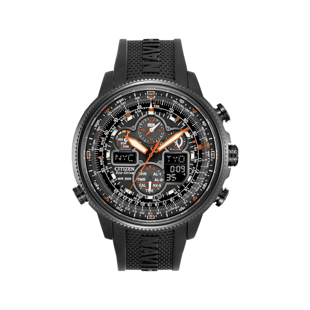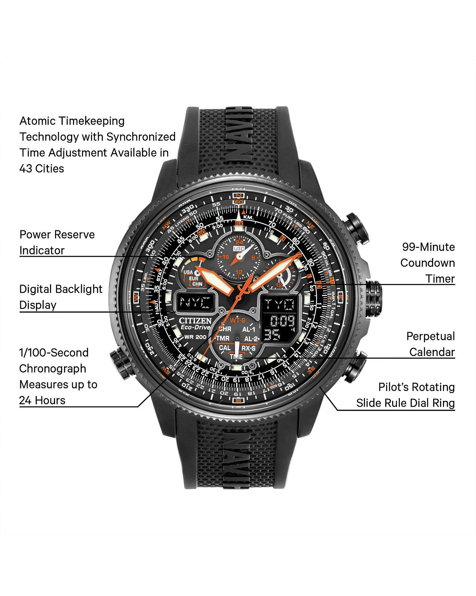 Citizen Men’s Promaster Navihawk Eco-Drive Pilot Watch, Atomic Timekeeping, Chronograph, Power Reserve Indicator, Luminous, Anti-Reflective Crystal Black Rubber Strap