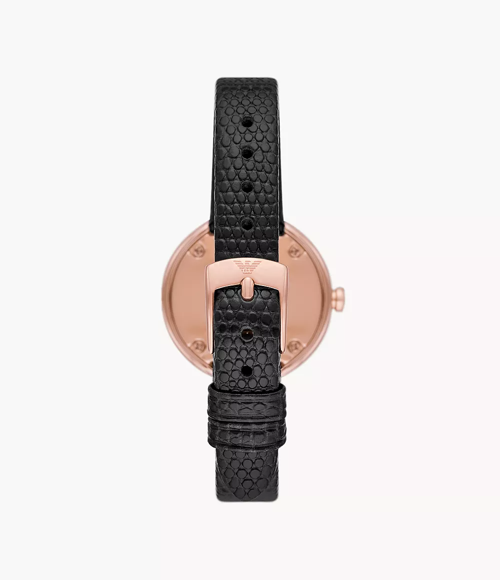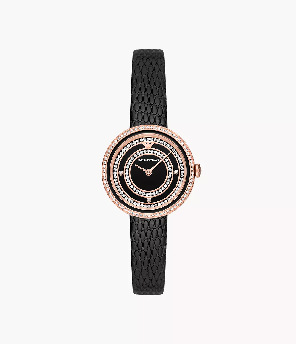 Emporio Armani’s 30mm watch features a black glossy dial with pavé rings, stainless steel rose gold stainless steel case filled with stones and black lacquer, two-hand movement and black leather strap.