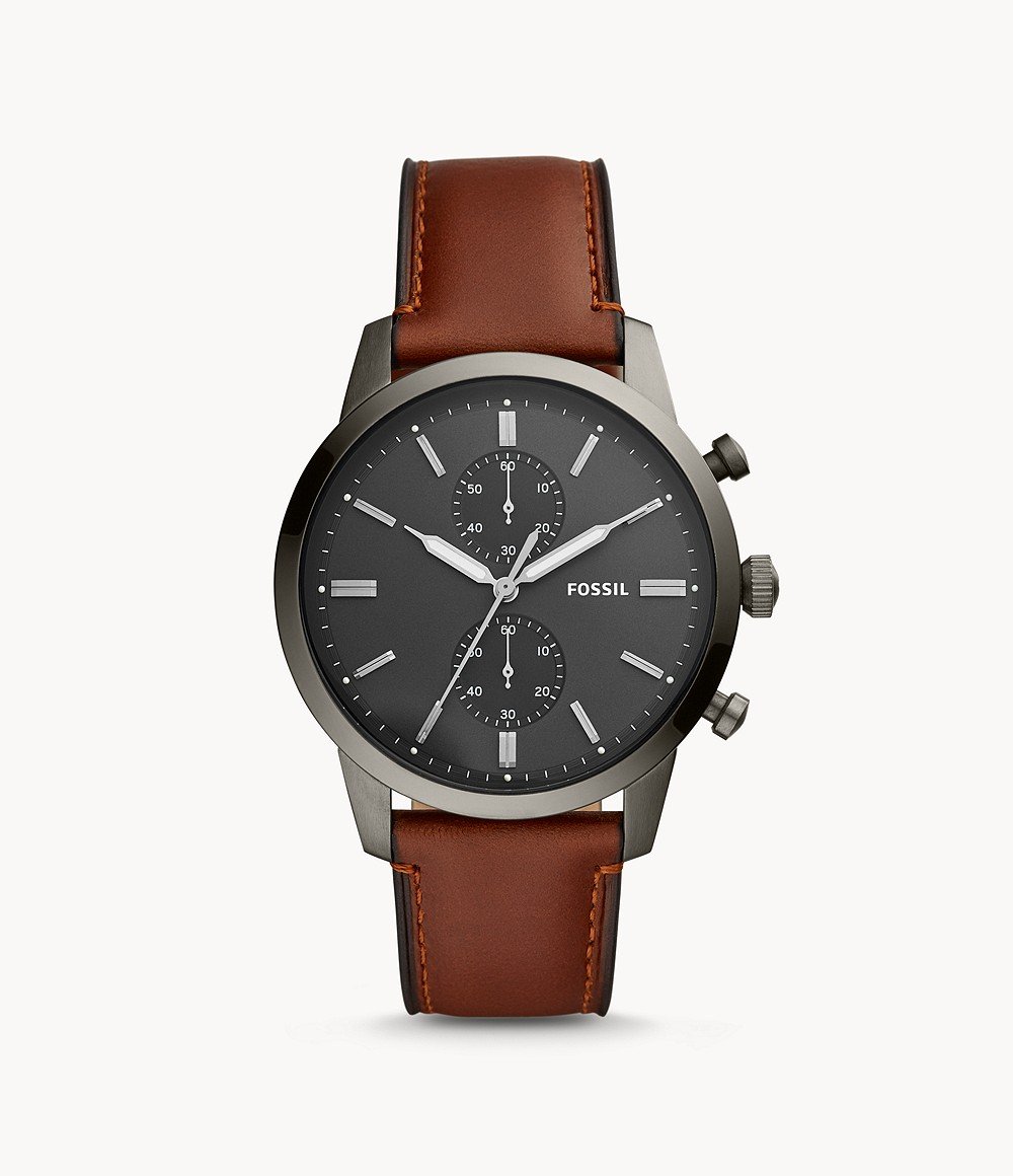 Stainless steel case with a amber leather strap. Fixed stainless steel bezel. Gray dial with luminous silver-tone hands and index hour markers. Minute markers around the outer rim. Dial Type: Analog. Luminescent hands and markers. Chronograph – two sub-dials displaying: 60 second and 30 minute. Quartz movement. Scratch resistant mineral crystal. Pull / push crown. Solid case back. Round case shape. Case size: 44 mm. Case thickness: 12 mm. Band width: 22 mm. Tang clasp. Water resistant at 50 meters / 165 feet. Functions: chronograph, hour, minute, second. Casual watch style. Fossil Townsman Chronograph Quartz Mens Watch FS5522.