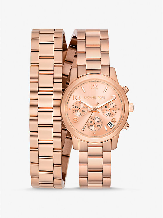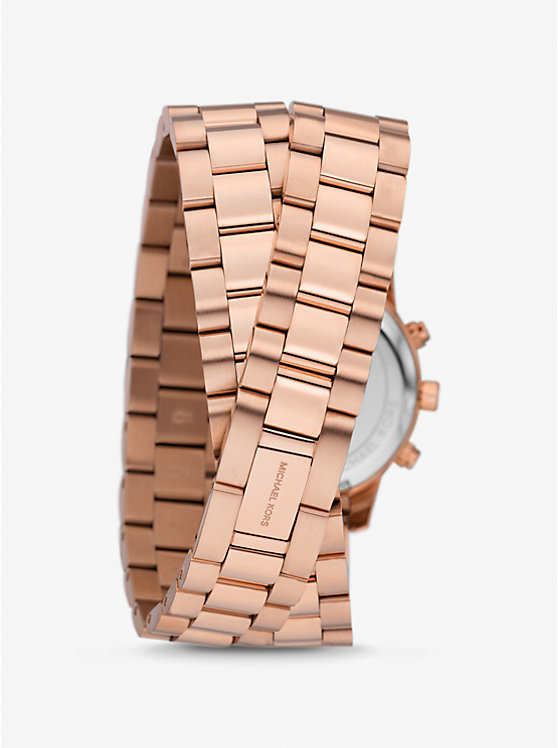 The newest addition to our Runway watch series is a decadent timepiece with everlasting style. Crafted from rose gold-tone stainless steel, it features chronograph details for precise timekeeping and an elongated bracelet strap that can be wrapped around the arm or worn at the neck as a choker. Complete with raised sub dials, this piece will add a modern finish to any ensemble.