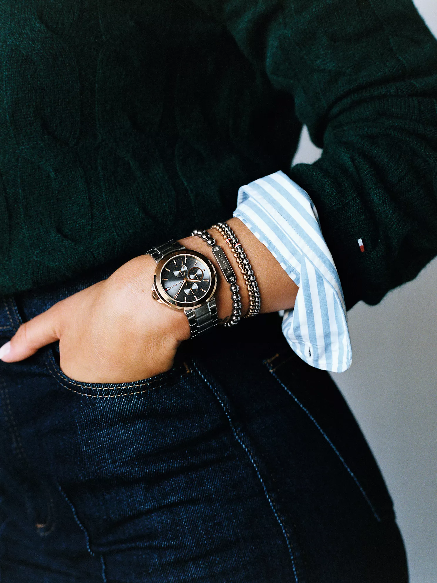 Tommy Hilfiger women’s watch. Make every minute count. Presenting our latest casual watch, distinguished by a circular brushed sunray dial and a trio of sub-dials showcasing weekday, 24-hour, and date registers. So simple yet so chic, you’ll never be late again.
